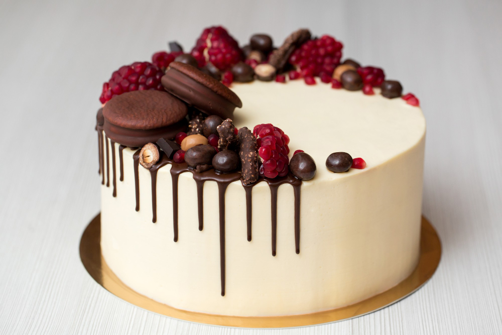 Das Gebäck kann oben mit bunter Zuckerpaste oder Spiegelglasur verziert werden. Die Konditoren arbeiten mit verschiedenen Dekorationsmöglichkeiten: Macarons, frische Blumen, verzierte Lebkuchen, Cupcakes und vieles mehr.